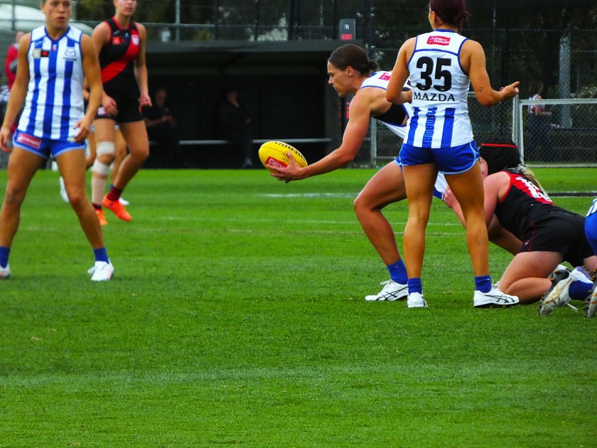Best on ground in last year’s Grand Final against Brisbane was veteran Jas Garner. On Friday she kept control of the ball under tackling pressure from Essendon: